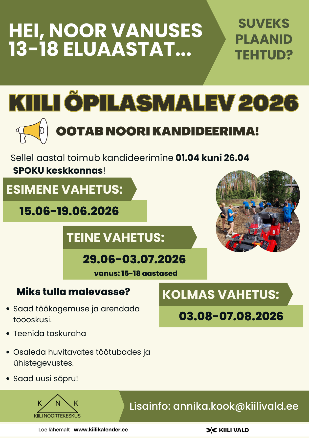 Malevasse on oodatud kandideerima noored vanused 13 - 18 eluaastat. Kandideerimine Kiili õpilasmalevasse algab 1. aprillist 2026 kell 16:00 ja kestab kuni 26. aprillini.