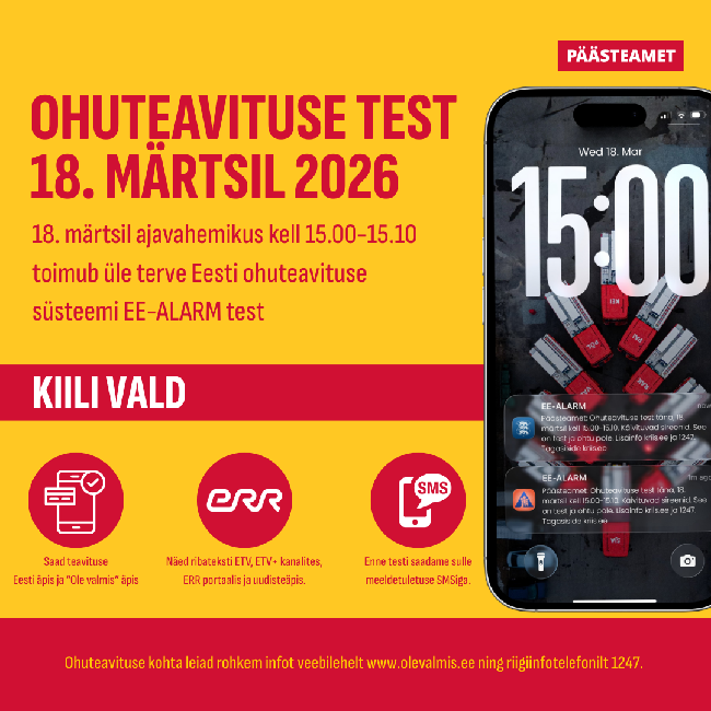18. märtsil 2026 saadetakse ajavahemikus 15.00 – 15.10 välja äpiteavitused Eesti äpis ning „Ole valmis!" rakenduses, edastame ohuteavituse ribatekstidena ERR kanalites ning käivitatame...