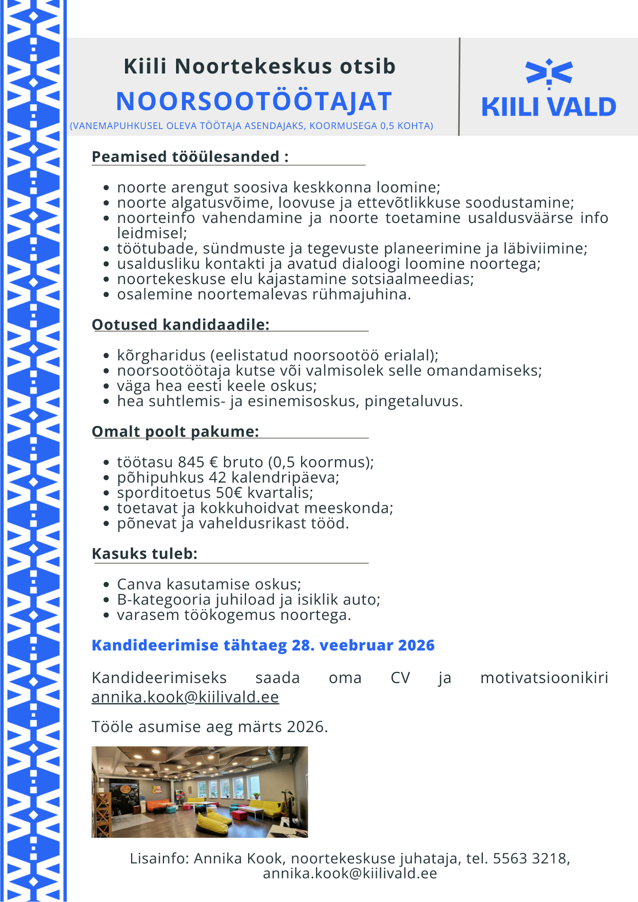 Kiili Noortekeskus võtab tööle noorsootöötaja (0,5 koormusega vanemapuhkusel oleva töötaja asendajaks). Töökuulutus CV.ee-s.
