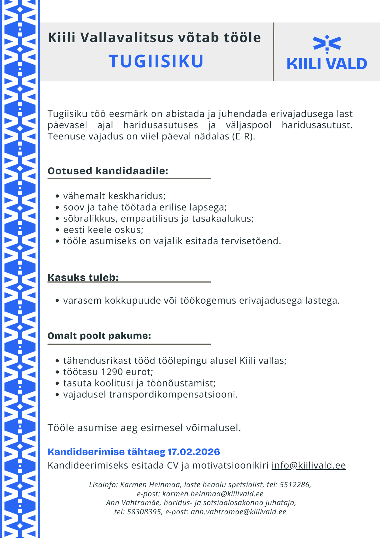 Kiili Vallavalitsus võtab tööle tugiisiku. Töökuulutus CV.ee-s.