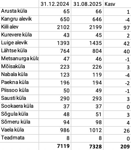 Käesoleva aasta kaheksa esimese kuuga on Kiili valla elanike arv kasvanud 209 inimese võrra ja uus rekordtähis on 7328. Võrreldes 2024. aasta ja eriti 2023. aastaga, on kasv olnud siiski mõõdukas ja asustusüksuste lõikes on nii kasvamist, kahanemist kui muutusteta olukorda.