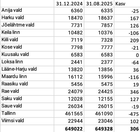 Harjumaa (koos Tallinnaga) elanike arv on võrreldes aastavahetuse seisuga suuremate muutusteta. Keskeltläbi pooltes maakonna omavalitsustes on toimunud tagasihoidlik kasv ning ülejäänutes kahanemine. Kiili vald on hetkel jäänud sisuliselt ainsaks omavalitsuseks Eestis, kus elanike lisandumine on tuntav.