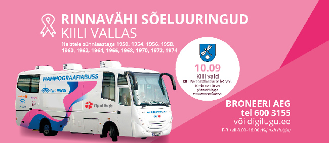 Rinnavähi sõeluuringust on võimalus osa võtta ka Kiili vallas. 10. septembril tuleb koostöös Viljandi Haigla SA-ga Kiili mammograafiabuss. Asukoht: perearstikeskuse kõrval asuvas parklas (Keskuse tn, Kiili alev).