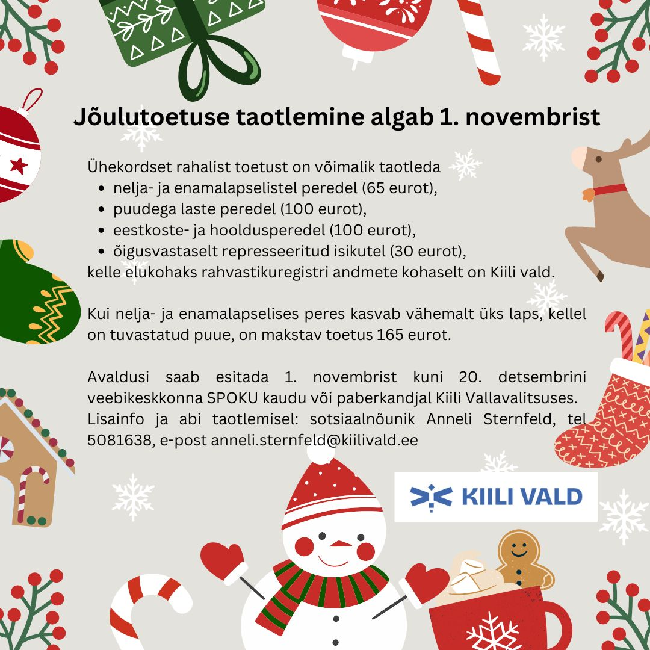 kelle elukohaks on rahvastikuregistri andmete kohaselt Kiili vald. Kui nelja- ja enamalapselises peres kasvab vähemalt üks laps, kellel on tuvastatud puue, on makstav toetus 165 eurot. Kui kõik on korrektne makstakse jõulutoetus välja hiljemalt 10 tööpäeva jooksul pärast taotluse esitamisest.