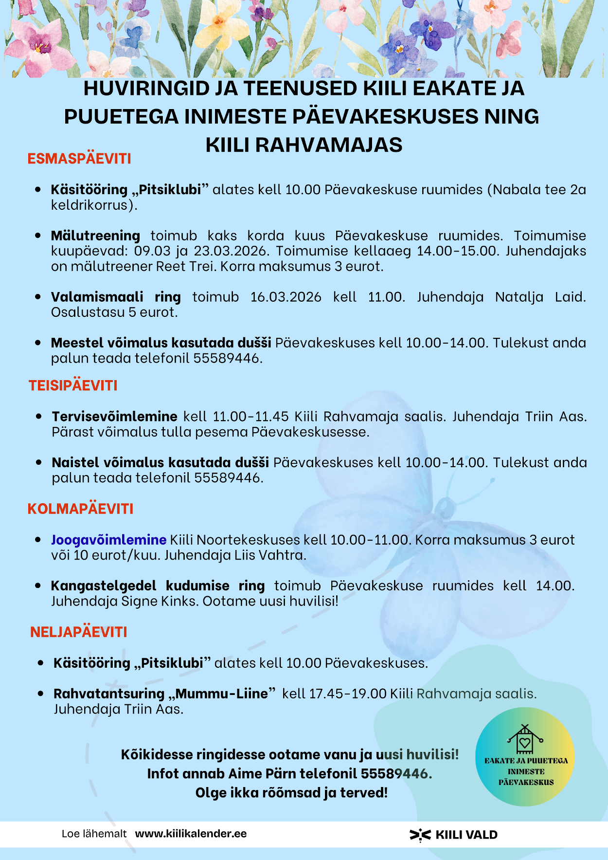 Kiili eakate ja puuetega inimeste päevakeskuse tegemised märtsis 2026. Olete oodatud osa võtma!