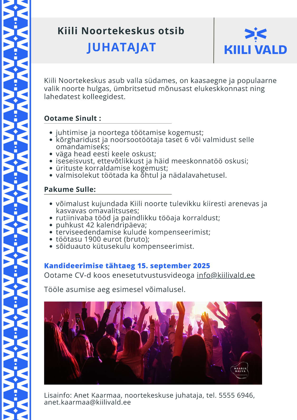 Hea noorsootöötaja! Kui omad juhtimise ja noortega töö kogemust ning soovid asuda tööle Kiili valla noortekeskusesse, kus ootavad sind rõõmsameelsed kolleegid ja toredad noored, siis kandideeri juba täna! Saada enesetutvustusvideo ning CV hiljemalt 15. septembriks 2025. Ootame sind!