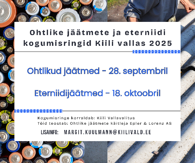 Sel sügisel saavad taas Kiili valla elanikud tasuta ära anda majapidamises tekkinud ohtlikke jäätmeid ja eterniiti. Ohtlike jäätmete kogumisring - 28. septembril 2025 ...