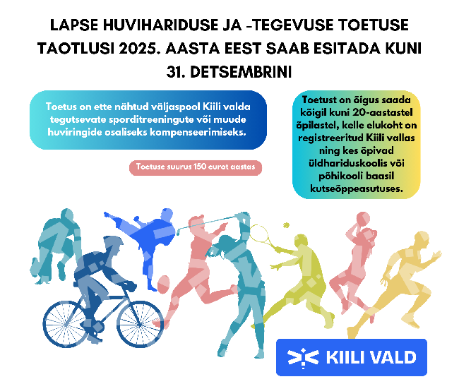 Lapse huvihariduse ja -tegevuse toetuse taotlusi 2025. aasta eest saab esitada kuni 31. detsembrini.  Toetus on ette nähtud väljaspool Kiili valda tegutsevate sporditreeningute või...