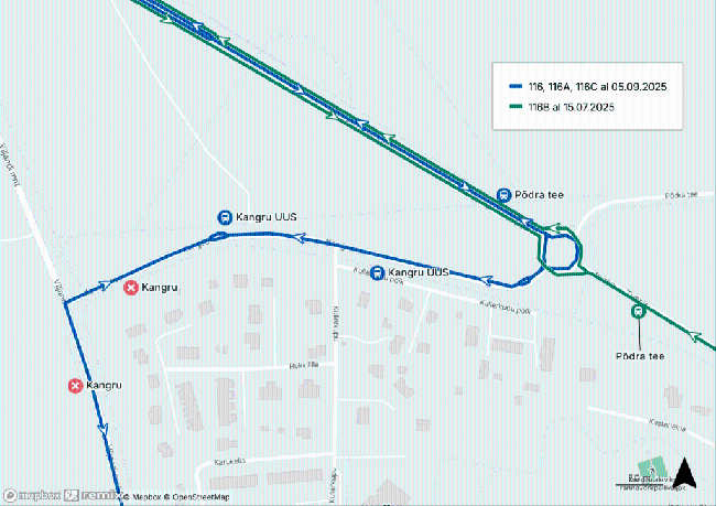 05. septembrist alates muutuvad Rail Balticu ehitustööde tõttu püsivalt 116, 116A ja 116C Kangru peatuste asukohad. Uued peatuskohad on tähistatud ning nende täpne paiknemine on nähtav...