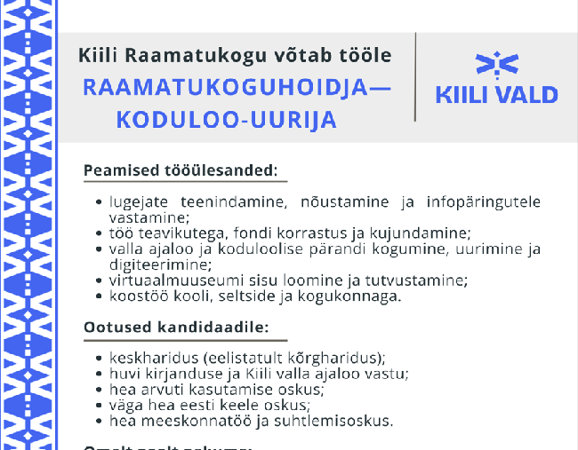 Kiili Raamatukogu võtab tööle raamatukoguhoidja-koduloo-uurija. Kui sulle pakub huvi: lugejate teenindamine, nõustamine ja infopäringutele vastamine; töö teavikutega,...